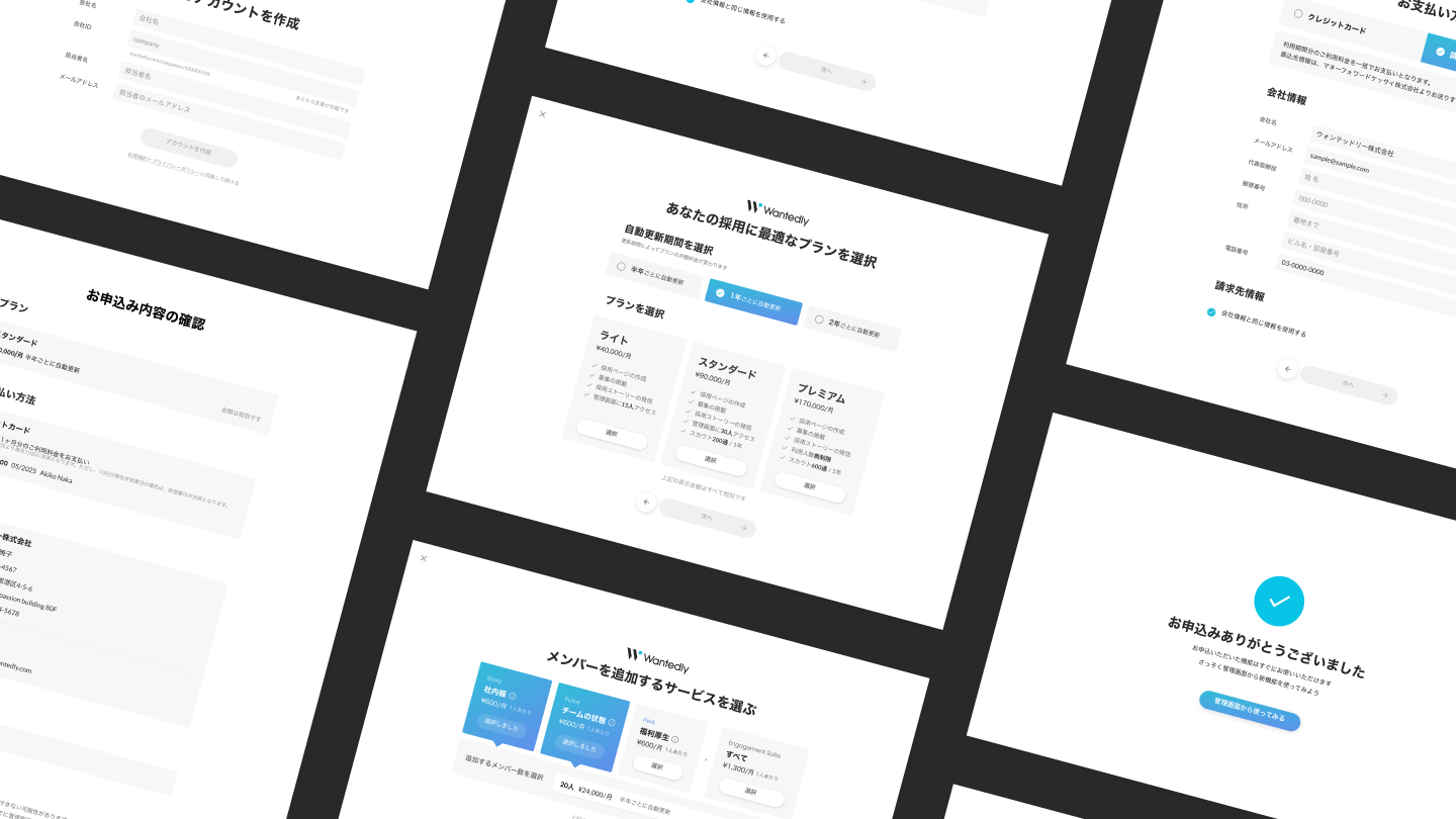 Wantedlyを利用して採用したいと思ってくださった企業様がプランを契約するフローを刷新。 契約期間とプランの選択画面や支払い方法、確認画面などの情報整理、一貫性のあるUIへと統一すると同時に、これまで顧客が抱えていた課題の解決を行なった。