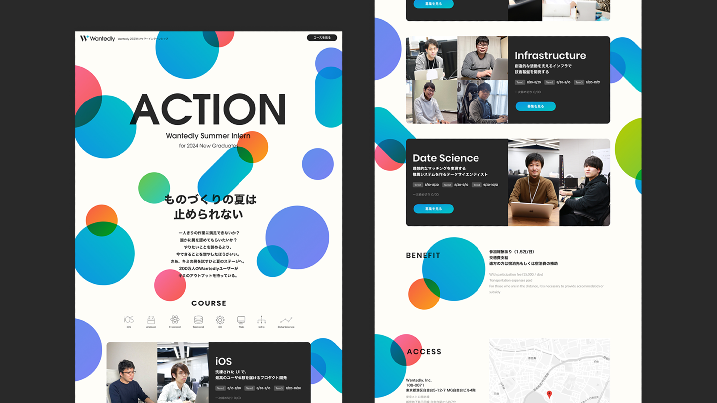 「ものづくりの夏は止められない」をテーマとして掲げた、24卒向けのサマーインターンシップの特設ページ。学生たちが持っているであろう「ものづくり」への欲求や胸の高鳴り、夏の鮮やかさや学生たちのフレッシュさを、カラフルで大胆なドットで表現した。