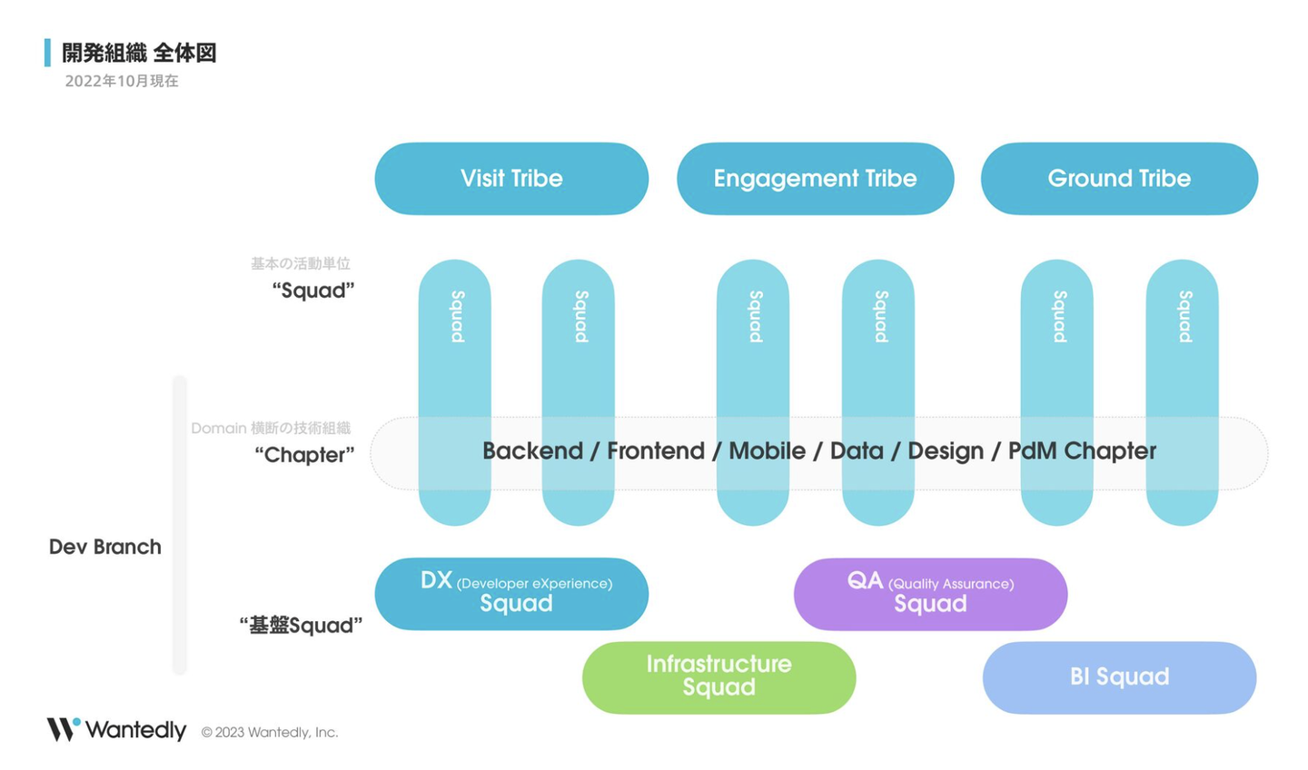 Frontend Chapter とは Wantedlyの開発チームは、マトリクス型の構成になっています。プロダクト開発組織は Squad と呼ばれる様々な職能が集う最小のチームに分かれています。また Squad を横断して専門領域ごとの課題を解決するChapterというチームもあります。一人のエンジニアは基本的には Squad と Chapter 両方に所属しています。自分の場合ですと、Visit growth squad という Wantedly Visit の機能改善をする squad に所属すると同時に、Frontend Chapter にも所属しています。