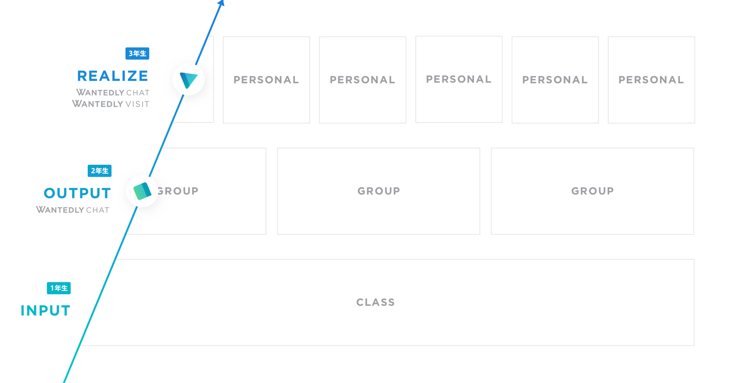 今後の展開として「Wantedly Chat」を使って高校2年生時に学生1人ひとりのコミュニケーションを活性化させ、高校3年生時には「Wantedly Visit」の『話を聞きに行く』ボタンを利用して実際に企業を訪問したり、ブログが投稿できるFeed機能を使って聞いた内容を外部に拡散するなど、個々が希望進路に合わせたコミュニティを構築していくことを目指しています。