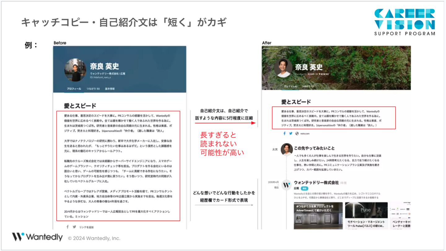 おそらく大半の会社さんがそうだと思うのですが、新卒採用の場合は、ポテンシャル採用を行う場合が多く、学生さんの志向性をよく見ています。実際にWantedlyで学生さんにスカウトをお送りすることがよくあるのですが、その際は「この先やってみたいこと」と「自己紹介文」の2つの欄が埋まっていると、志向性の部分が見えやすくなって、ご連絡しやすくなります。