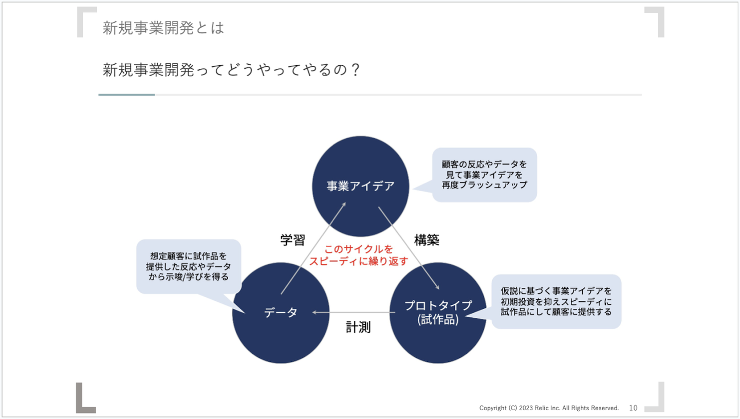「事業アイデアをつくる」→「試作品をつくる」→「試作品を提供してテストマーケティングをした結果のデータを集めて分析後、事業アイデアをブラッシュアップする」のサイクルを高速に回し、仮説検証を繰り返すことが重要です。早く失敗することが新規事業を行ううえでの成功の秘訣とも言われています。