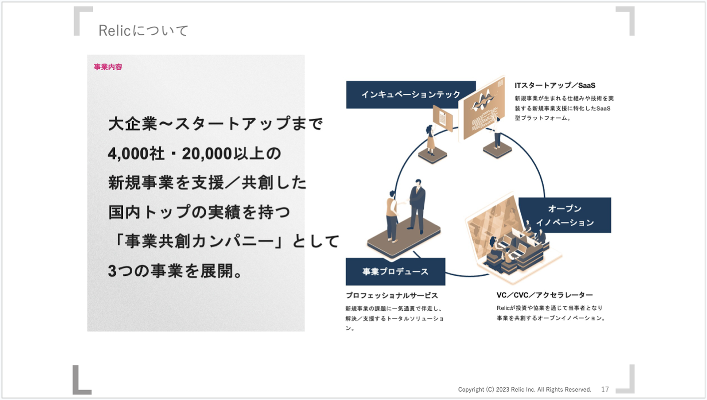 Relicは、新規事業開発やイノベーション創出に特化したITスタートアップで、今年で創業9年目を迎えます。「インキュベーションテック」「オープンイノベーション」「事業プロデュース」の3つの事業を展開しています。
