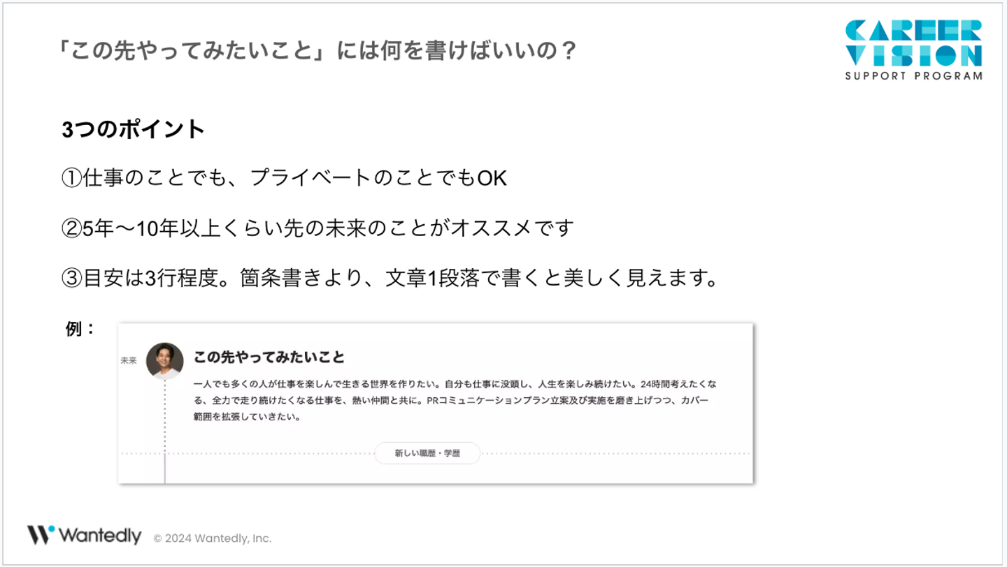 Wantedlyでは、学生さんのキャリアづくりを支援することを目的とした「CAREER VISION SUPPORT PROGRAM(キャリアビジョン サポートプログラム)」を2024年3月に開始しています。