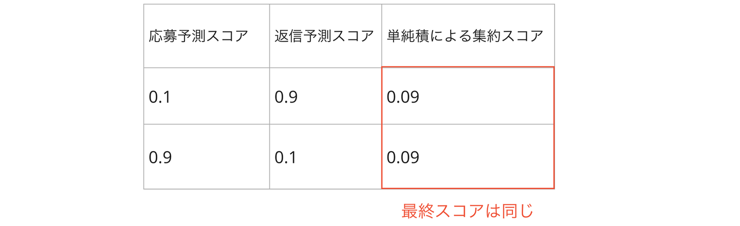 しかしながら1つ問題があり、実験した相互推薦システムでは集約関数として単純積を使っているために「ユーザーが応募する確率が高いが企業から返信が来る確率が低いユーザー・募集ペア」と「ユーザーが応募する確率が低いが応募したとしたら企業から返信する確率が高いペア」が同列に扱われてしまっていました。単純積で集約すると (応募予測値, 返信予測値) = (0.1, 0.9), (0.9, 0.1) の場合の最終スコアが同じになってしまうためです。