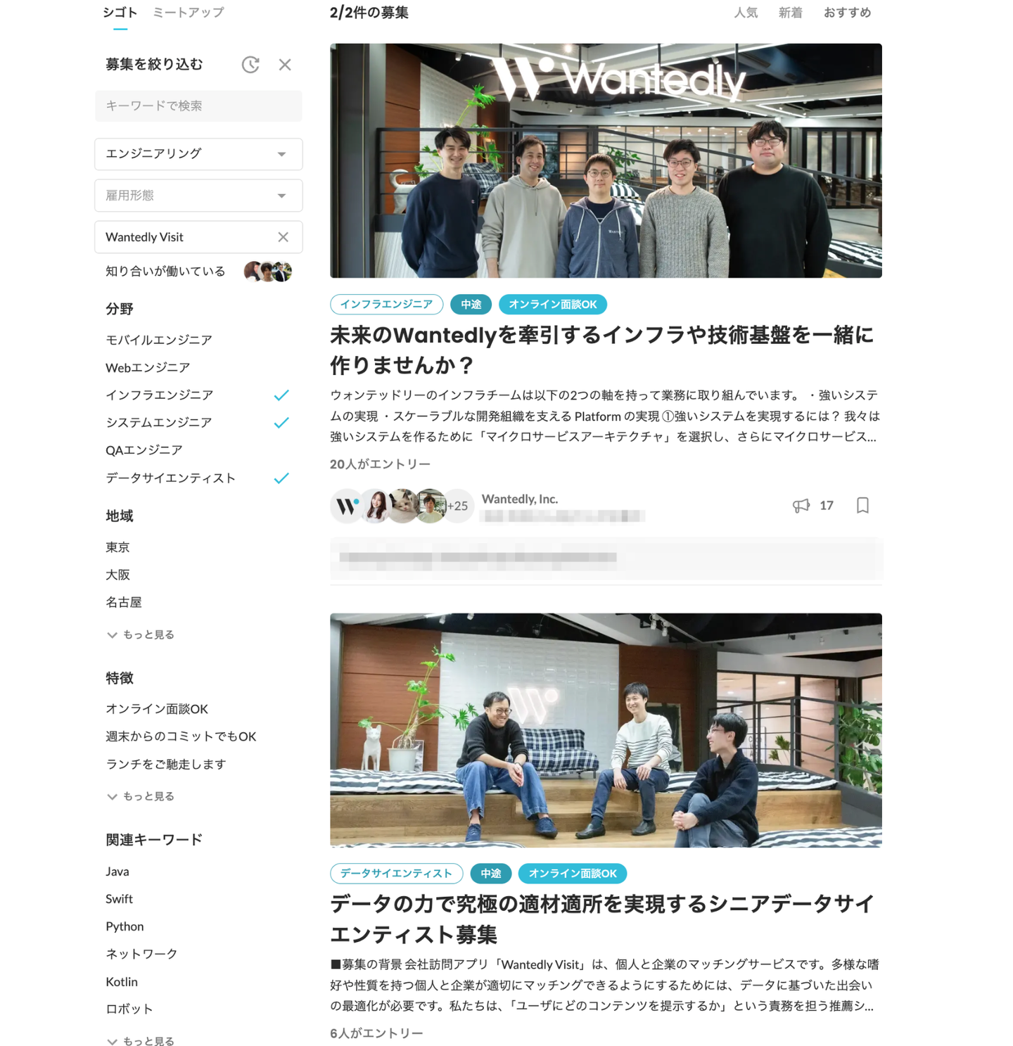 会社訪問アプリ Wantedly Visit (以下 Visit) では、ユーザーが話を聞きに行きたい募集を見つけることを補助するために様々な場所で推薦システムが活用されています。今回スコープとしているのは、この中の1つで「募集一覧ページ」と呼ばれる部分での推薦の話です。募集一覧ページは下のような見た目になっており、画像とともにユーザーに対しておすすめの募集が並んでいます。