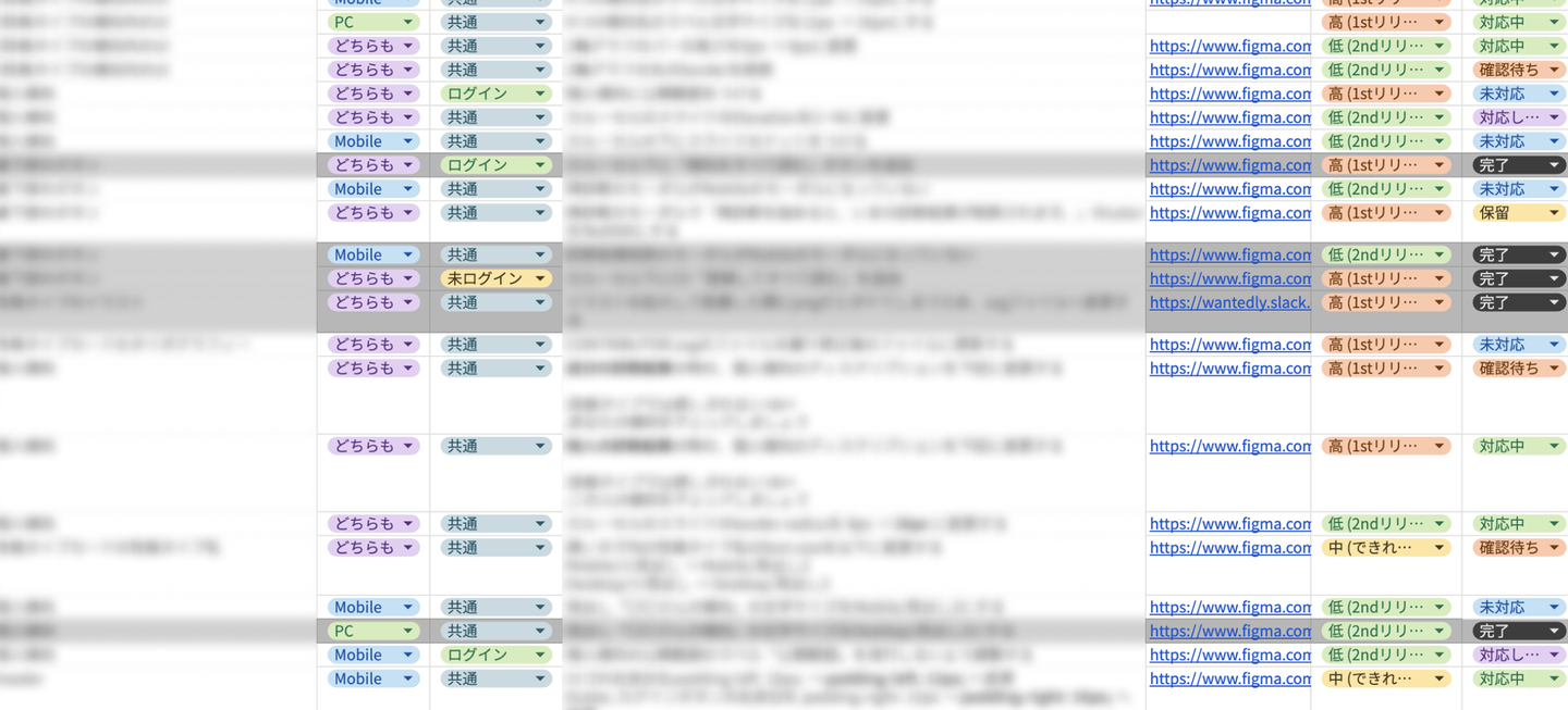 これまで、小さな修正であればFigma上に修正用のキャプチャを貼ってエンジニアに共有したり、Slack や Github上でフィードバックすることもありましたが、大量の修正が必要な今回のケースにはいずれも合っておらず、たどり着いたのはGoogleスプレッドシートで管理するといった手法でした。