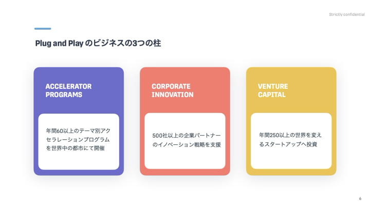 日下さん:Plug and Playは、世界最大級のイノベーションプラットフォームです。弊社では、世界中の都市で年間60以上のテーマ別アクセラレーションプログラムを開催する「アクセラレータープログラム」、550社以上の企業パートナーのイノベーション戦略を支援する「コーポレートイノベーション」、年間250社以上のスタートアップへ投資する「ベンチャーキャピタル」という3つのビジネスを展開しています。