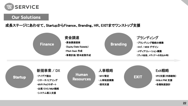 北岡さん:弊社は『スタートアップと共に「社会にインパクトを与えたい」』というミッションを掲げて活動しています。企業の「最初の一歩」のサポートを目的に、成長ステージにあわせて、ファイナンスからブランディング、HR、EXITまでをワンストップで支援しています。