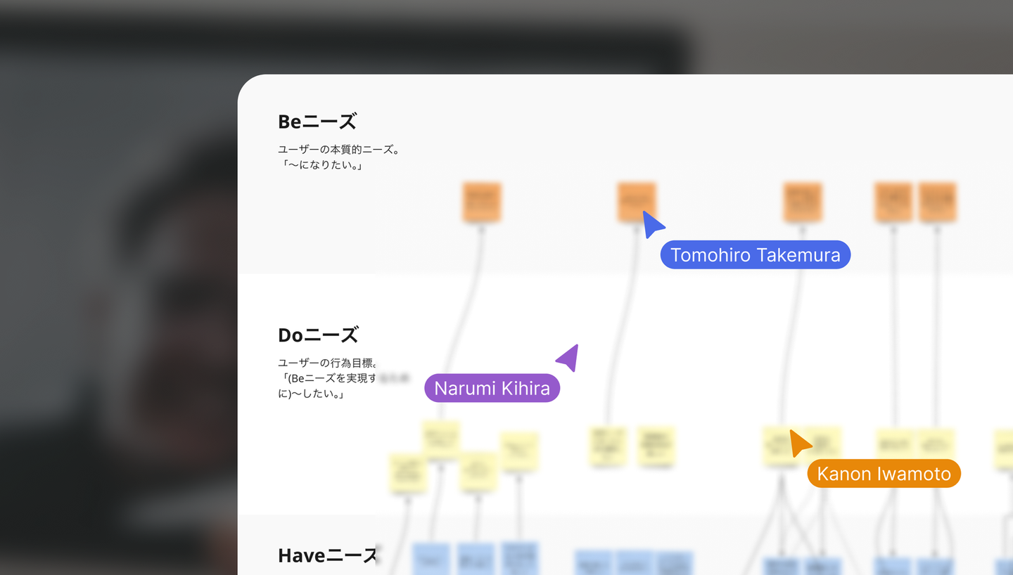 採用プラン契約企業の採用担当様へ、 顧客のインサイトや採用課題の把握を目的として実施。プロダクトデザイナーを中心に開発メンバーと一緒になり、ユーザーインタビューや分析ワークショップを実施した。