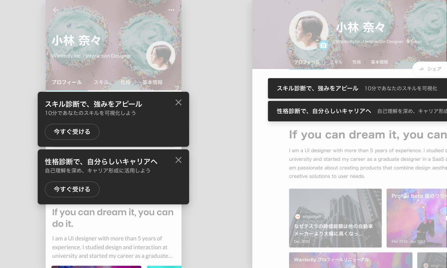 アクションリストが表示されないユーザーに対しても「性格診断」と「スキル診断」への導線を表示。診断コンテンツが新たに追加されたことに気づいていないユーザー対しての認知向上と、利用促進のための改善を行った。