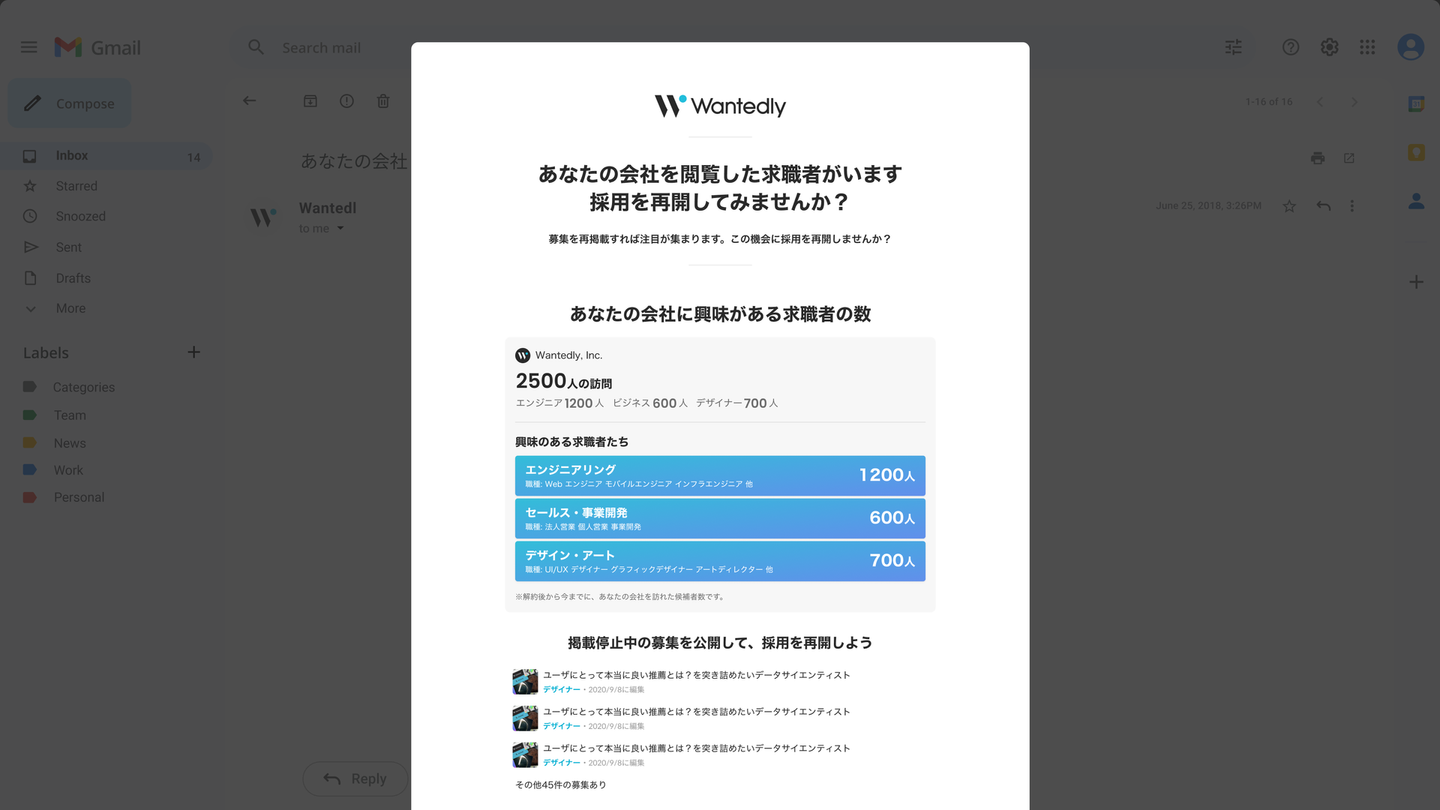 採用活動を行う際、自社の求める人材が媒体上にどの程度いるのか分からないという悩みを抱える企業に対し、Wantedly上でマッチする可能性がある求職者数をメールで通知。参考情報を出すことで、採用活動の再開を促す施策を行った。