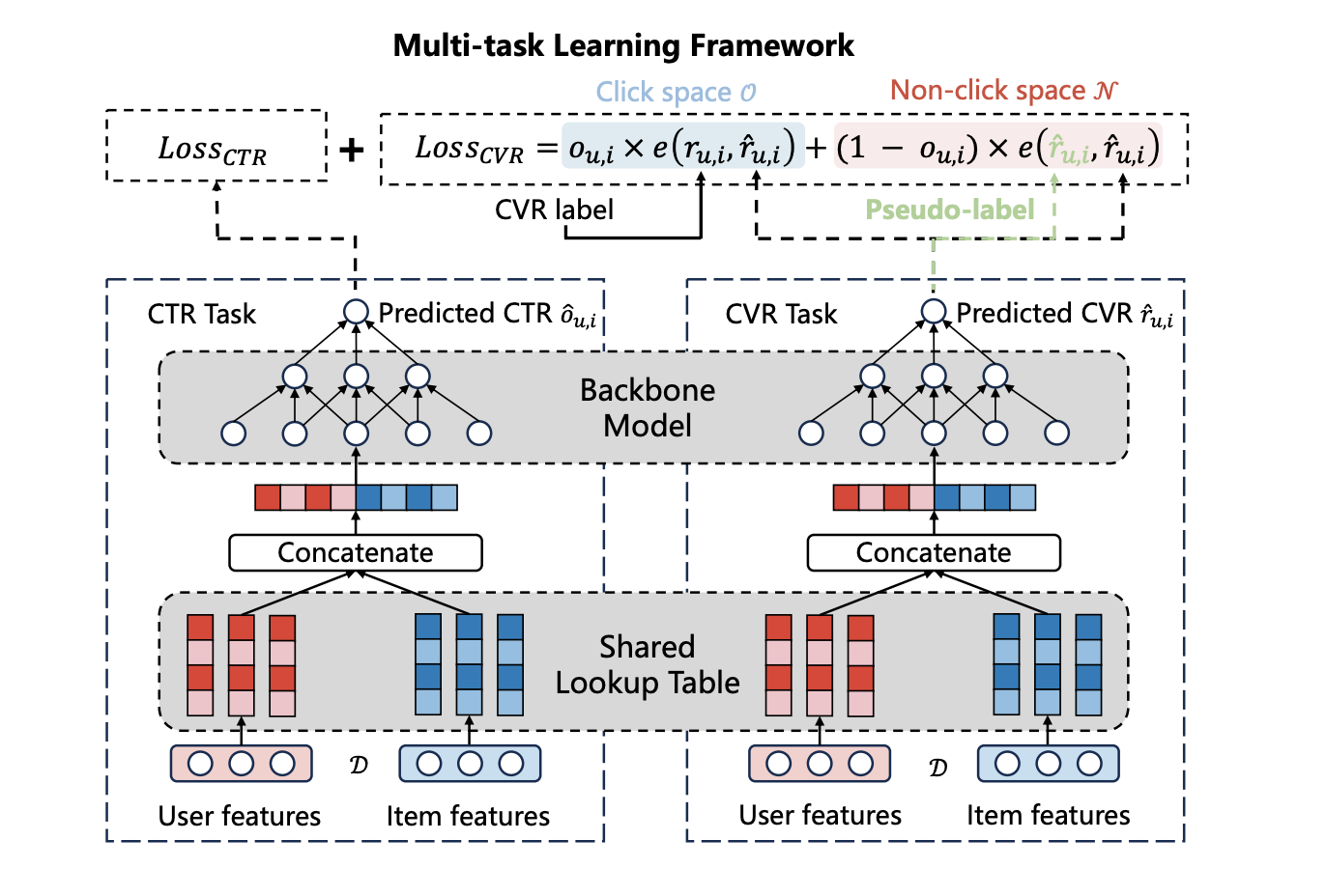 筆者らは、CTR予測と組み合わせたマルチタスク学習のフレームワークと、クリックが発生していないデータに対して擬似ラベルを活用することによって上記の問題に対処しています。(下図は論文から引用)