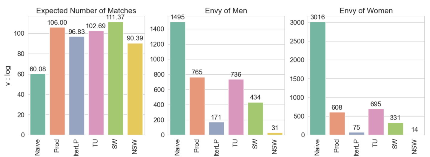 サイバーエージェントさんの相互推薦モデルにおける公平性に関する論文です。デーティングサービスのようなtwo sideプラットフォームで、両サイドのユーザー(デーティングサービスの文脈では男性と女性)でNash Social Welfare (NSW)を最大化することによって、両サイドの不公平さを大きく減少させられることを、合成データと実データを使った実験で示しています。(下図は論文から引用)
