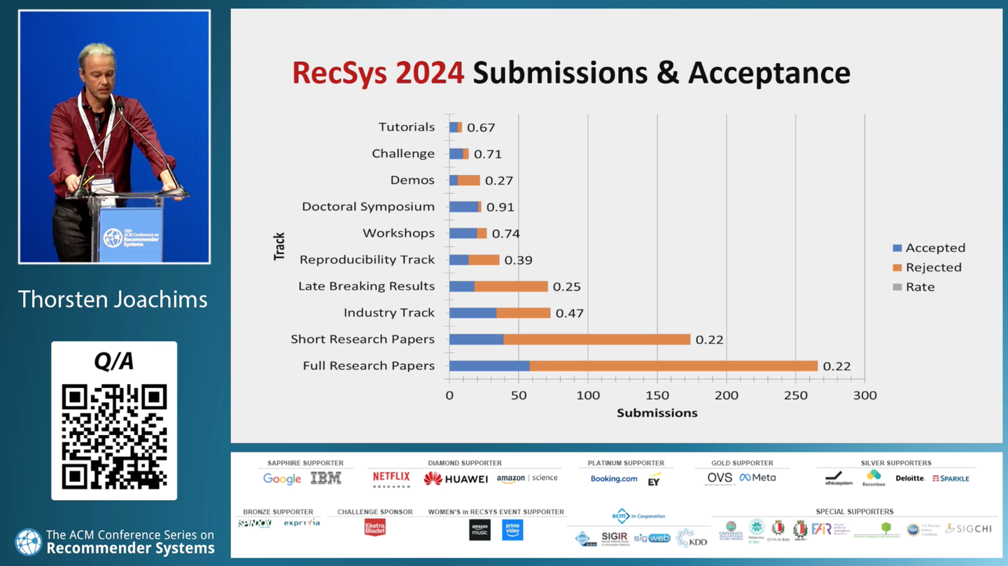 ちなみに論文の採択率に関して見てみると、やはりFull/Short Research Paperは採択率が22 %ほどで、狭き門であることが伺えます。企業が主に論文を出すであろうIndustry Talkは採択率47 %、Workshopsは74 %でした。