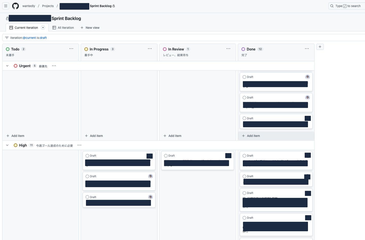 自分の場合は、以下のようなボードをデイリーシンクアップで同期的にアップデートすることでタスク状況のキャッチアップを行っています。