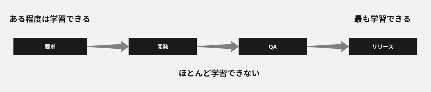 リーンプロダクト開発の考え方に則り、継続的な学習サイクルこそがプロダクト価値を最大化すると仮定すれば単位時間あたりの学習量というのは重要な要素になります。最も学習できるのがリリース後であることは言うまでもありませんが、開発で学習できることが無いということは案外忘れがちではないでしょうか。もちろん開発を無くすことは不可能ですが、要求からリリースまでのサイクルタイムを短くすることでプロダクト開発全体の学習を加速できるのです。
