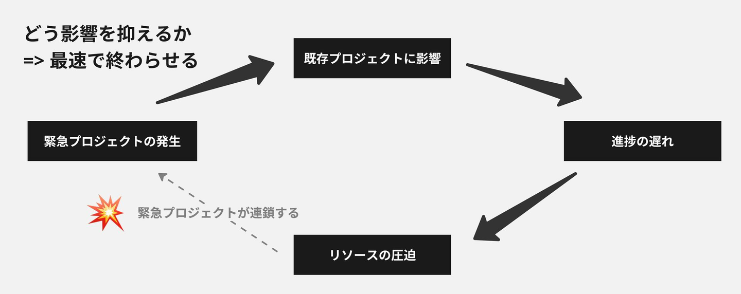 こういった負の連鎖を断ち切る一番の方法は、発生した緊急プロジェクトを最速で終わらせて他への影響を最小限に抑えることです。自明ですが大事なことです。