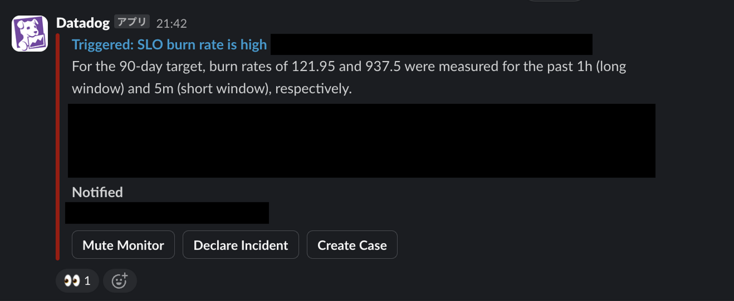 これまではひとつの Burn rate alert を運用してきましたが、Long window が24時間と設定していたため問題の検知に時間がかかっていることから、閾値設定の難しさを感じていました。これを解消するために The Site Reliability Workbook の “6: Multiwindow, Multi-Burn-Rate Alerts” で紹介されているように、multi-window の burn rate alert の導入を進めています。SLO と burn rate alert については明日の Advent Calendar の記事で詳しくご紹介しますので、ぜひお楽しみにお待ちください。