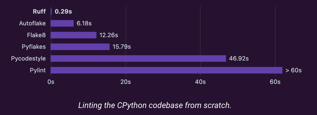 幅広い機能やルールを提供するという Ruff の特徴は、1つのツールで多くを実現できるというユーザー視点の利便性だけでなく、パフォーマンスにも寄与しているのです。