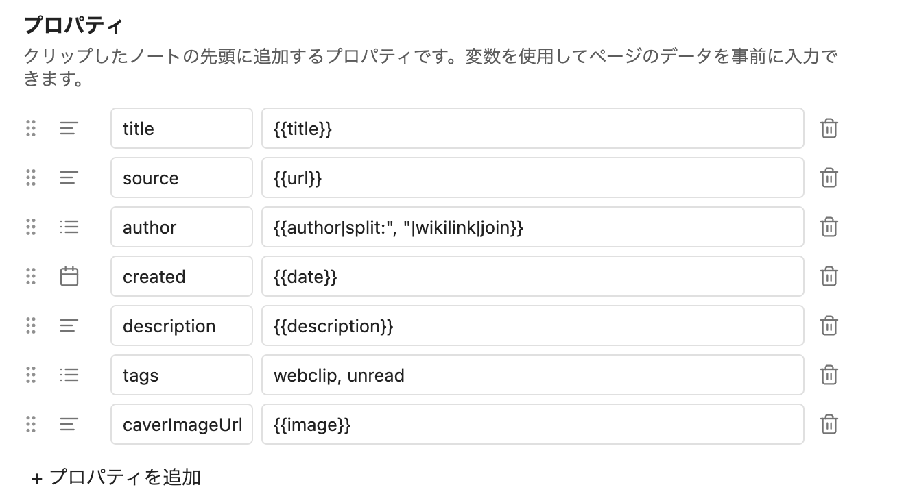 webclips/)プロパティの設定ではタイトルやURLなどの変数を使って自由にレイアウトを設定できます。カード形式で表示したいので以下形式でテンプレートを登録しました。
