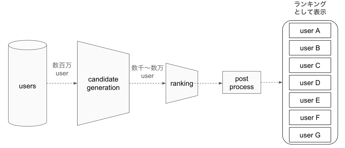 スカウト担当者が見たことがないユーザーの表示量を多くするためには、スカウト推薦のどこかしらの段階で考慮する必要があります。Wantedly Visitのスカウト推薦システムは下記図に示すような大まかにCandidate Generationフェーズ・Rankingフェーズの二段階に分かれる2-Stage推薦が行われています。
