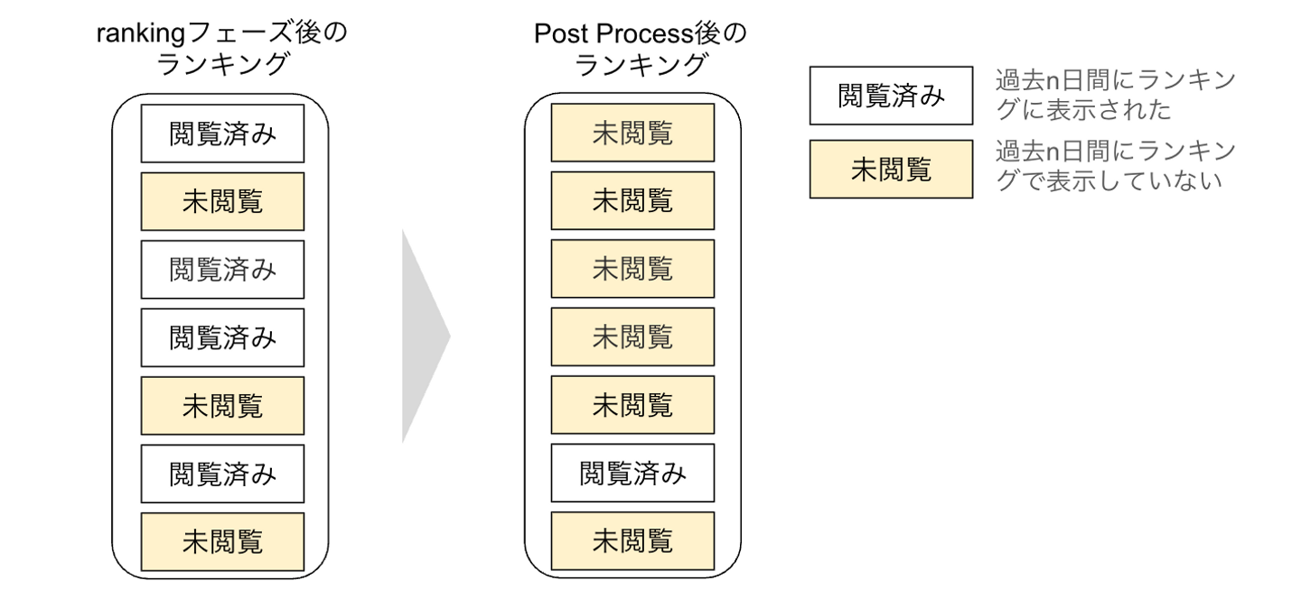 先に紹介したように、Rankingまでのフェーズでコントロールしきれない要件(例: ビジネス上の制約)を実現することを意図したPost Processのフェーズが設けられています。これまでにもビジネスロジックとして複数種類のPost Processが適用されていましたが、今回見たことがないユーザーを考慮するためのPost Processを新たに追加しています。