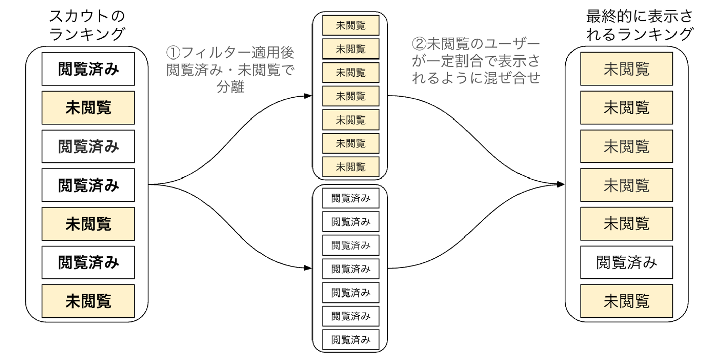 スカウト担当者がスカウト検索画面において過去に表示した回数に応じて、見たことがないユーザーを優先表示するようなPost Processを適用しています。処理の中身としては、見たことがないユーザーを必ず優先するというものではなく、見たことがないユーザーの出現割合を調整するようにしています。これによって、将来的に見たことがある/ないユーザーの出現割合をコントロールしたくなった際にも、パラメータを変更するだけで変更可能なようにしています。