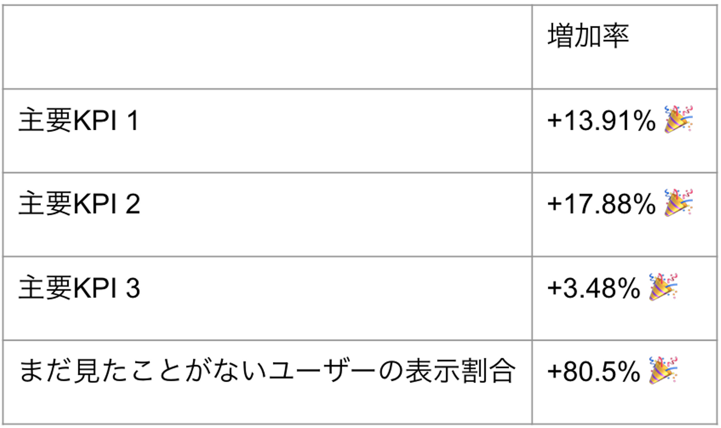 まだ見たことがないユーザーに関しては増加傾向を示し、今回行ったPost Processによって想定通りの介入効果があることがわかります。これと同時に主要KPIが向上しており、良い介入効果が現れていることがわかりました。(KPIの内容については公開できませんが、かなり大きなインパクトが見られる結果となりました)