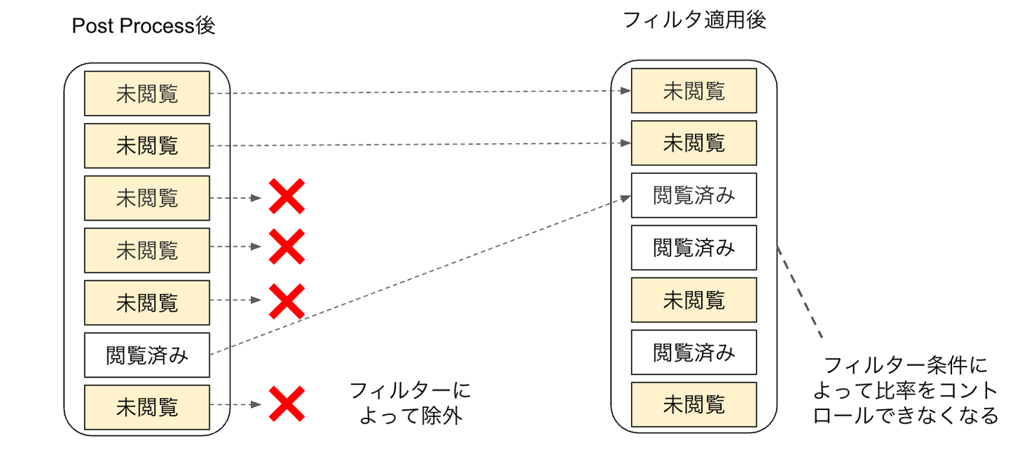 Wantedly Visitのスカウト検索では多くの採用担当者がフィルター機能を利用しています。このフィルター機能は動的に条件が決定されるため、ランキング構築時に仮に未閲覧ユーザーの表示割合をコントロールしたとしても、利用するフィルターによって閲覧済み・未閲覧を調整したランキングから更に変更が入り込んでしまい、うまく閲覧済み・未閲覧のコントロールができなくなってしまいます。