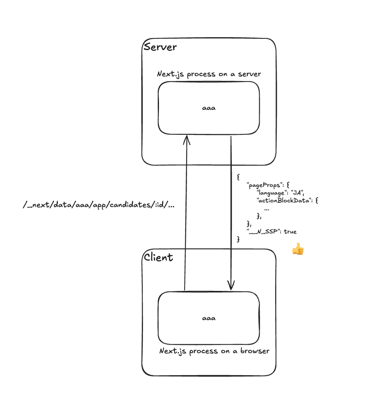 この getServerSideProps はそのページが SSR されるとき -- つまりフルページリロードが実行されるタイミング -- には HTML 生成処理の前段で実行されます。一方、Next.js アプリケーション上で SPA 的なページ遷移をするタイミングでは WebAPI 的な挙動をします。以下に例を示します。