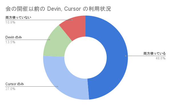 さらに、AI Enabling Squad が導入を推進している Cursor と Devin の利用状況を見ると、いずれか一方のみ、もしくはいずれも利用していないエンジニアが半数にのぼりました。