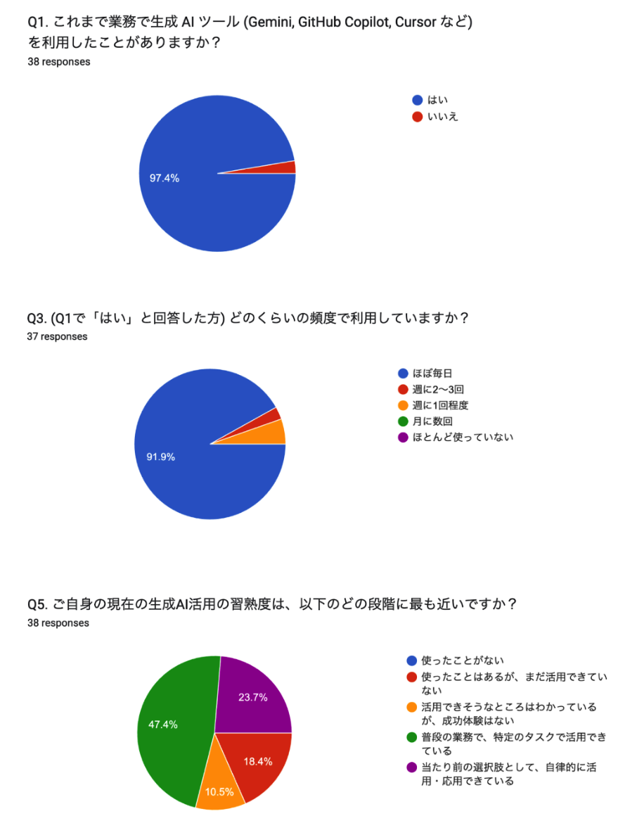 これらの事後アンケートの結果から、活用が進まない根本的な原因は、単にツールを知らない・触ったことがないという「認知・体験」のフェーズではなく、「自分の日々の業務に、具体的にどう応用すれば良いか」というイメージが持てない「実践・定着」のフェーズに課題があることが明確になりました。今回の会は Cursor や Devin といった具体的な生成 AI ツールの認知度向上や関心を高める点では大きな成果がありましたが、汎用的な使い方を提示するだけではエンジニア個々の多様なタスクに結びつけるのが難しいという、次のステップが見えたことが大きな収穫でした。単にツールを提供するだけでは不十分で、日々の業務における具体的なユースケースの提示や、最初の成功体験を積むまで伴走するような、より一歩踏み込んだサポートが必要であることが明確な課題として見えました。