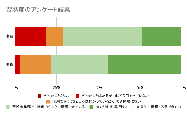 AI Enabling 会を実施した結果を評価するために、事後アンケートを実施しました。習熟度は事前と事後で比較して次の結果になりました。