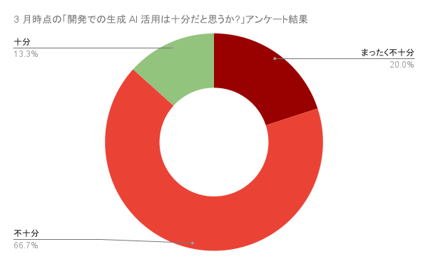 こうした課題を裏付けるように、ウォンテッドリーの開発組織で毎月実施している開発者アンケートでも、「開発での生成 AI 活用は十分だと思うか」という設問に対し、AI Enabling Squad 発足前の 3 月時点では「十分だ」と回答した人が 2 割程度に留まっていました。