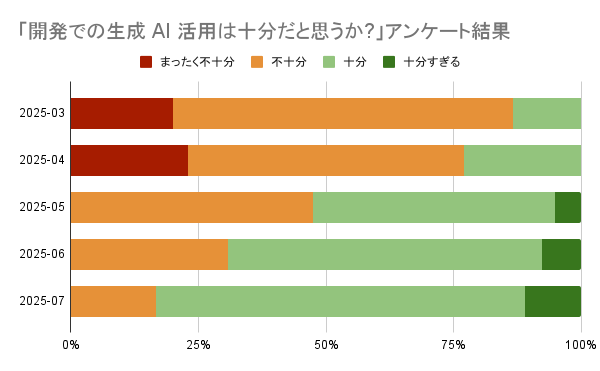 AI Enabling Squad によるツール検証やガイドライン整備、今回のような会の実施といった取り組みの成果は、前述した開発者アンケートにもあらわれています。3 月から 7 月にかけて「開発での生成 AI 活用は十分だと思うか」という設問に対して十分であると回答した人が 3 月時点では 2 割程度でしたが、記事執筆時点での 7 月には 8 割を超えるまでに増加しました。