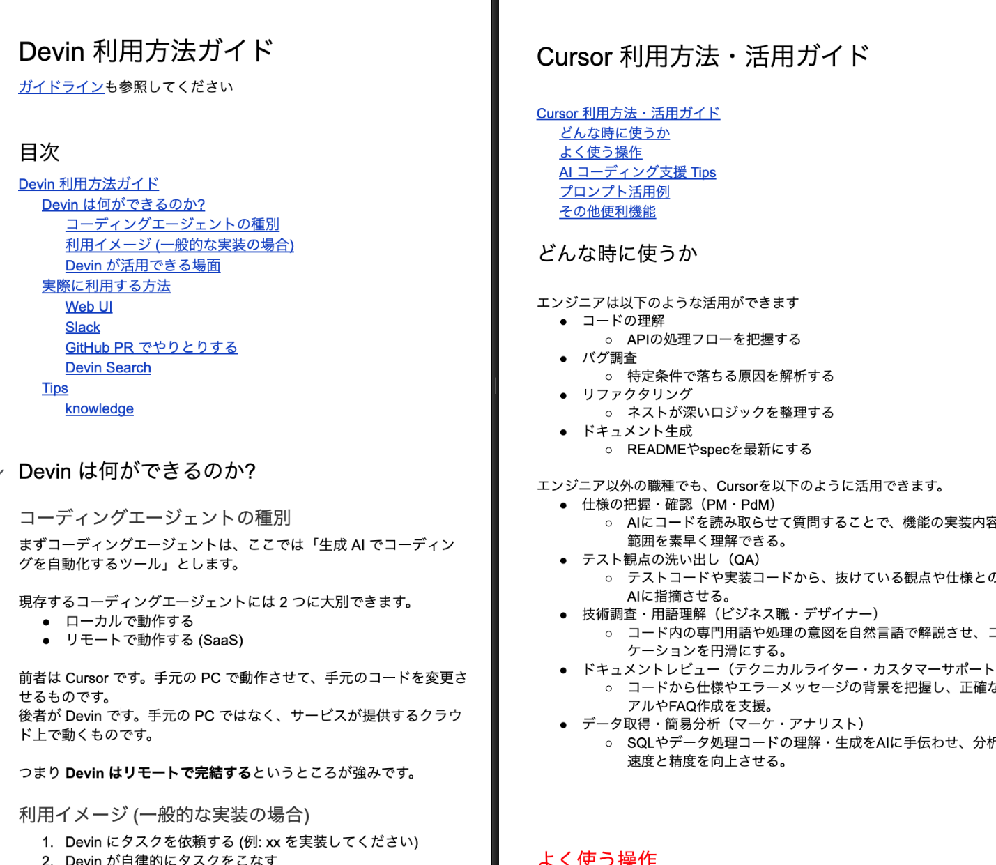また、全員が漏れなく利用できるようにするためには、ルールで縛るだけではなくまだ十分に活用できていない方へのサポートも必要です。AI Enabling Squad では事前に以下のような Cursor や Devin といったツールの利用方法のガイドラインを用意した上で、各チームに 1 人以上のエバンジェリストを任命しました。