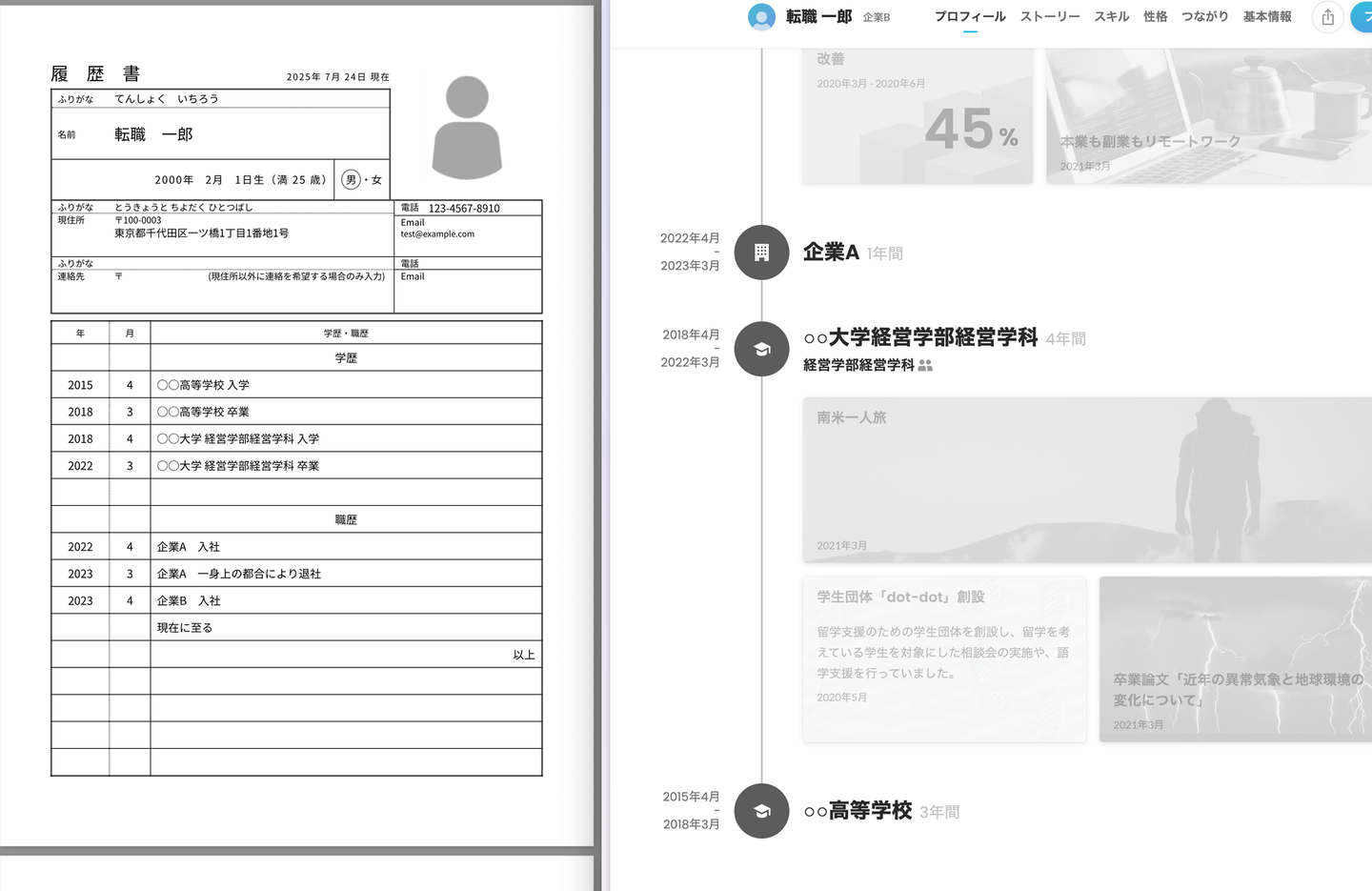 }左の履歴書から右のプロフィールを生成でき、数分かかる作業を20秒程度で終える事ができました。今回は履歴書をベースに登録を行いましたが、経歴を登録しているSNSのURLを入力する事などでも可能そうです。