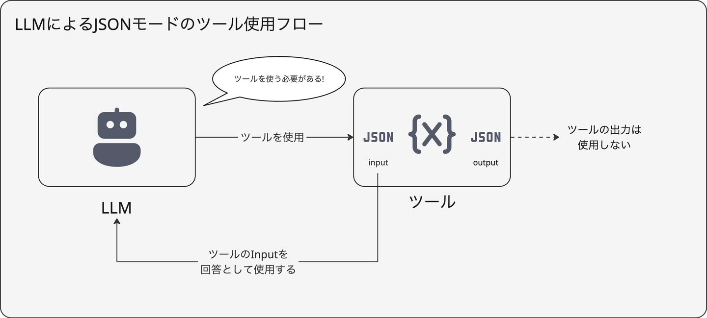 { "model" : "<LLMのモデル名>" , "tools" : [ { "name" : "<ツールの名称>" , "description" : "<ツールの説明>" , "input_schema" : { "type" : "<ツール入力全体の型>" , "properties" : { "<プロパティ名>" : { "type" : "<プロパティの型>" , "description" : "<プロパティの説明>" , } , } , } , } ] , "messages" : [ { "role" : "user" , "content" : "<ユーザープロンプト>" , } , ] , } 通常、定義したツールの結果を使用してLLMの回答を生成します。一方で、JSONモードでは input_schema に定義されたJSON構造をLLMの出力として使用します。このモードはLLMがツールを使用する際に input_schema で定義されている構造へLLMが回答を整形するため機能しています。図解すると以下のようになります。