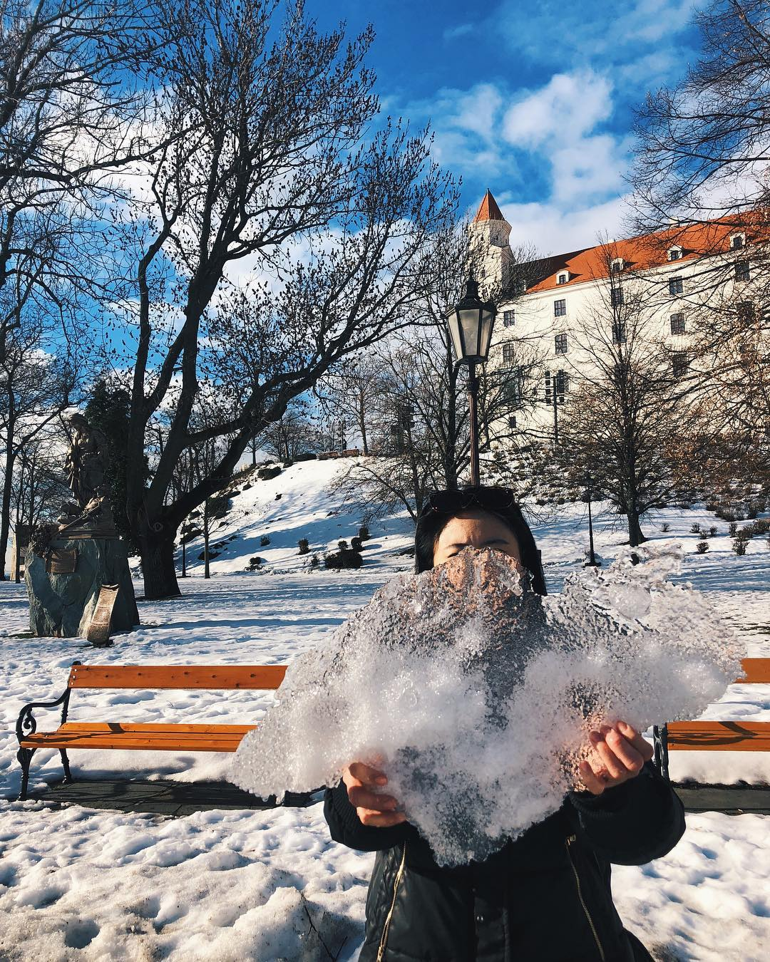 Finding signs of Singapore wherever she goes – a random Singapore-shaped ice sheet atop Bratislava castle!