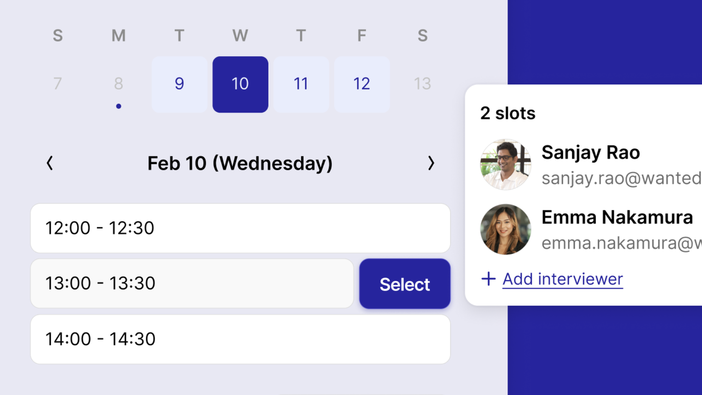Wantedly Hire centralises scheduling inside the ATS. Recruiters choose interviewers, let the system compute overlaps, and send candidates scheduling links with automated reminders. Confirmations and reschedules are logged alongside candidate data, and Slack notifications keep stakeholders updated.