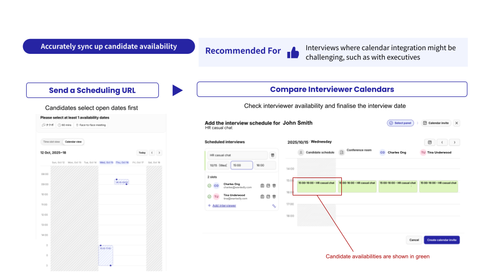 - Interviewers connect their calendars (Google Workspace, Outlook, or Teams).