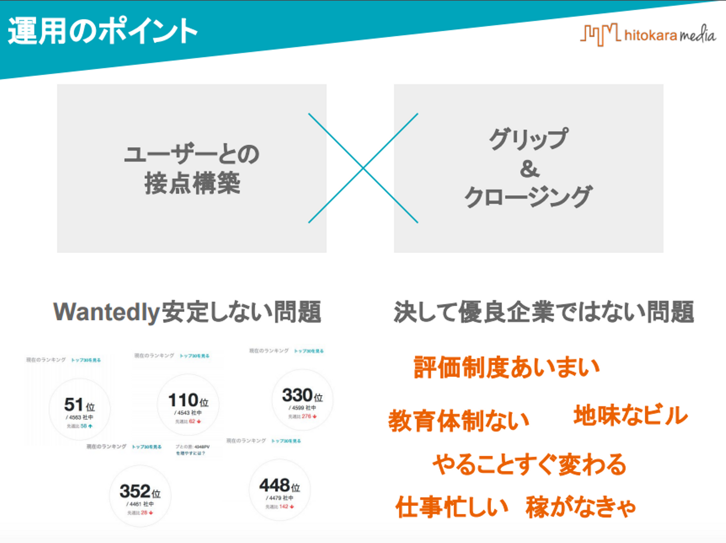 ・ちゃんとコミットしないと、人は取れない。 1週間も放置すると、エントリーが皆無になる。常にアクティブな状態を作り続けるのが大事。