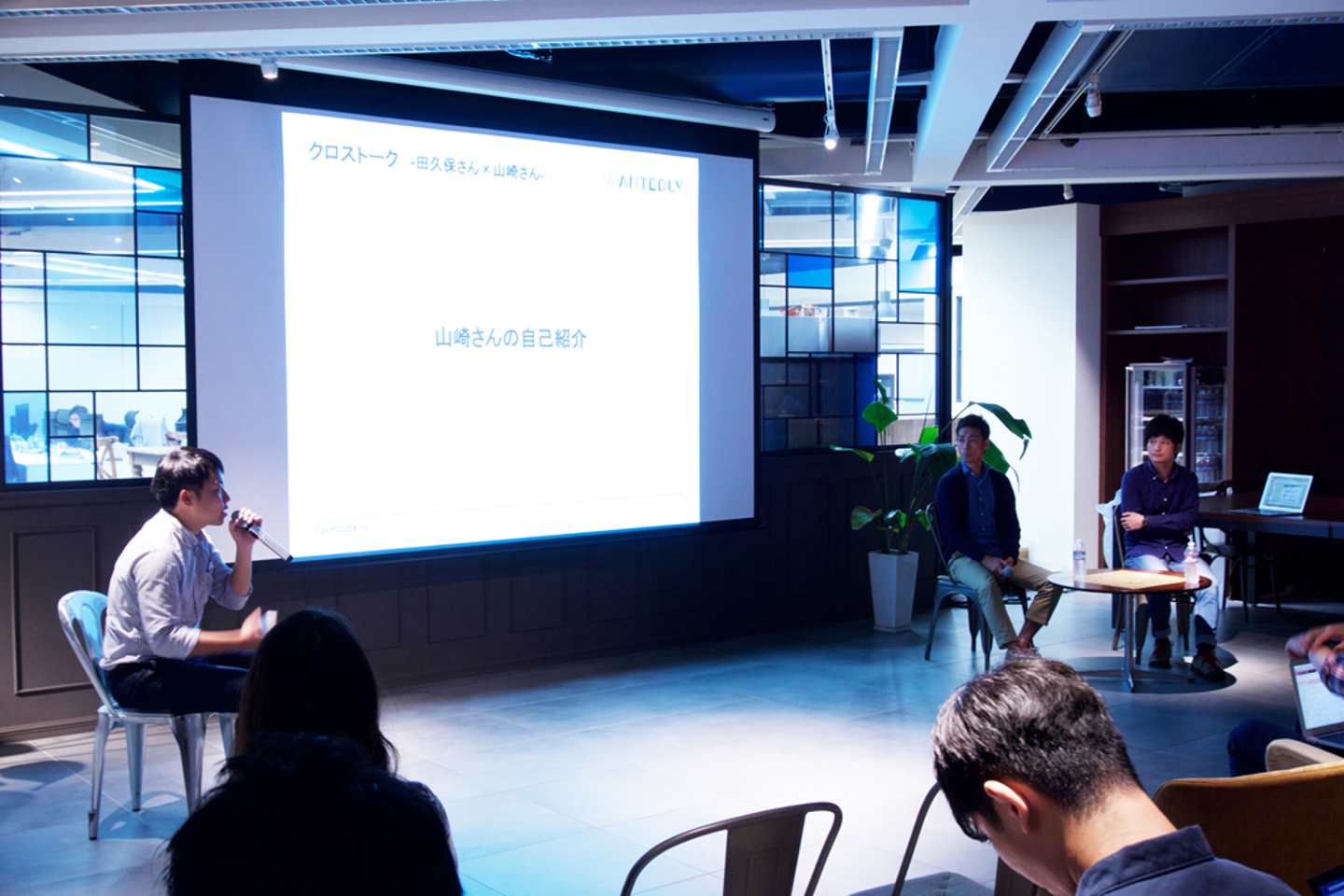 第二部では、引き続きヒトカラメディアの田久保さんにもご登壇いただき、株式会社アールキューブの山崎さんとのWantedlyの使い方を議題とした、パネルディスカッションを行いました。