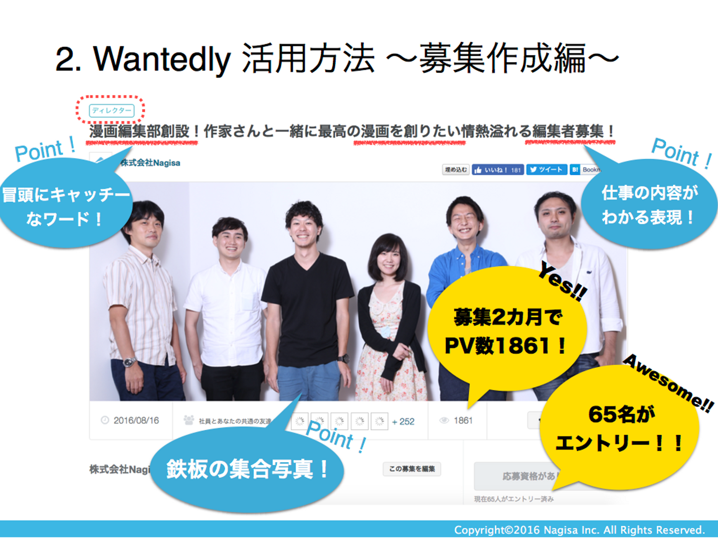 Nagisa鈴木:ベタですが、上を握ることです。まず、リーダー陣を集めて説明会を開きWantedlyとはどんな媒体なのか、なぜ弊社との相性がよく、力を入れて運用していくべきなのかを理解してもらいました。社内を巻き込むためには、一方的にただ「協力してください!」と言い続けるだけでなく、「なぜ」の部分を理解してもらう必要があると思ったからです。