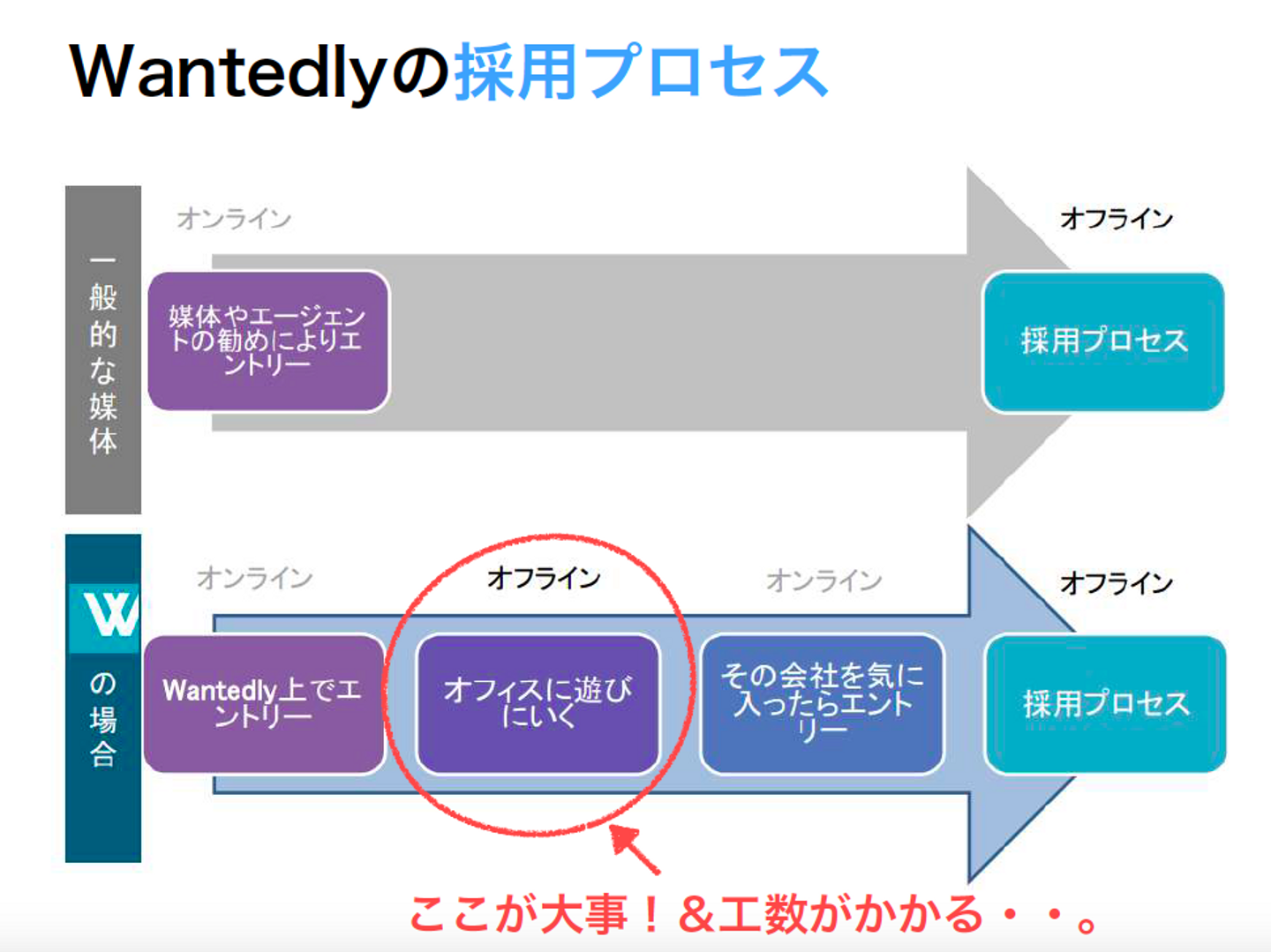 面接に至るまでの流れも、他のエージェントや採用媒体を使う場合に比べ、比較的ゆっくりとしています。そのため、Wantedly独自のシステムである「オフィスに遊びにいく」というステップは工数がかかる一方、Wantedly経由で採用をするためには大事なフェイズです。