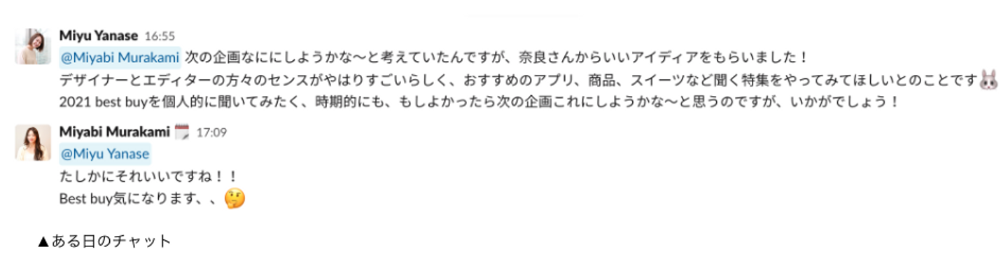 ・Slack(社内チャット)の企画チャンネルへの投稿内容 から連想させることが多いです。