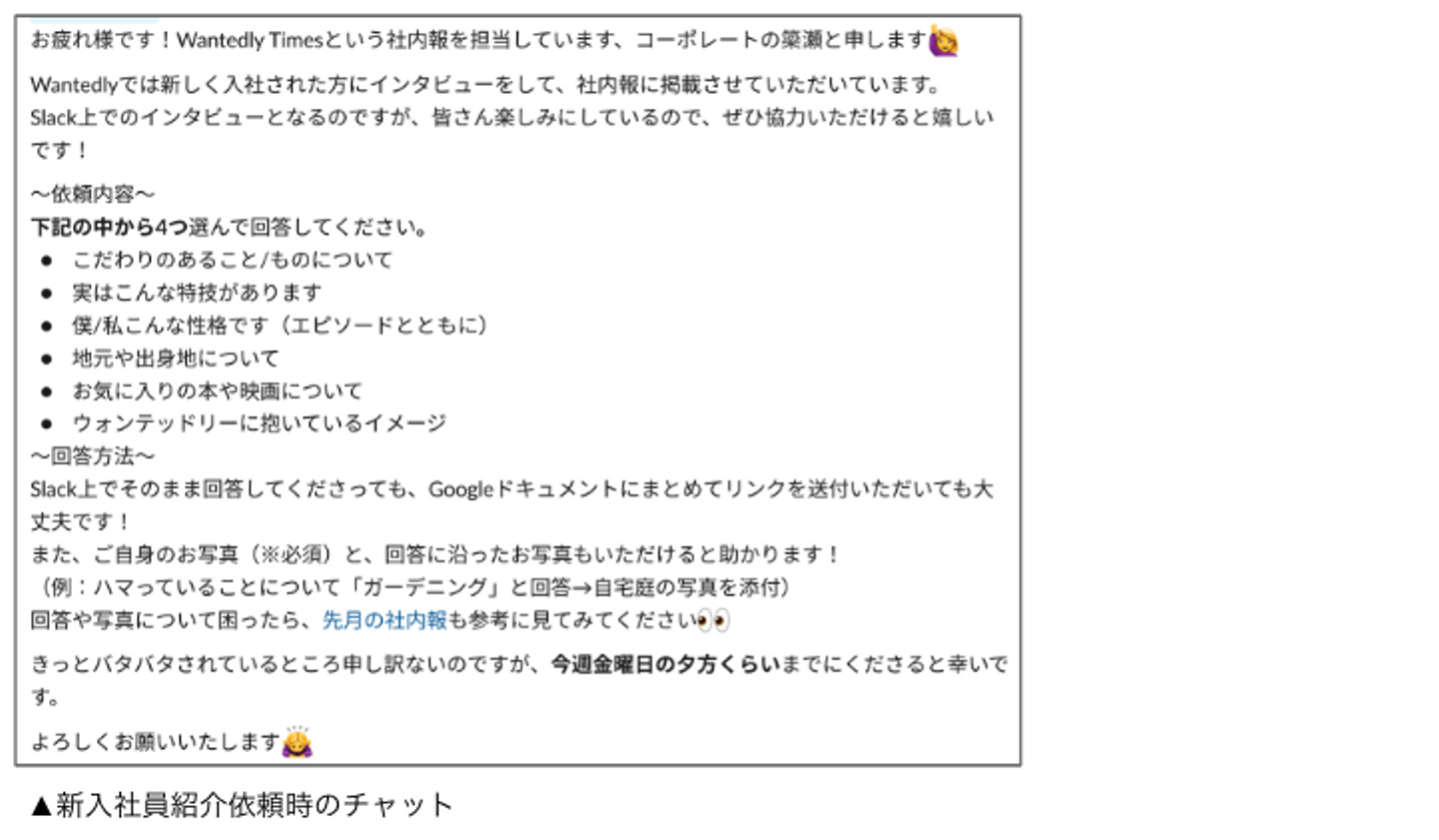 新入社員紹介はテンプレートがあり、新入社員の方にはテンプレートに沿って回答をしてもらっているので、ほとんど時間はかからないです。(約30分)