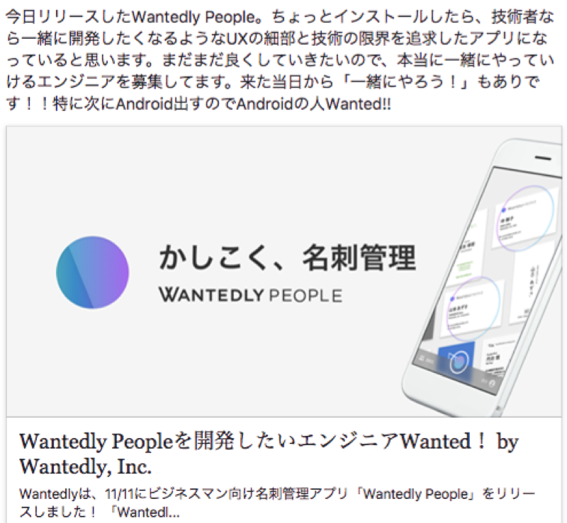 弊社を例にお伝えします。先日Wantedlyでは『Wantedly People』という新しい名刺管理アプリをローチンしました。