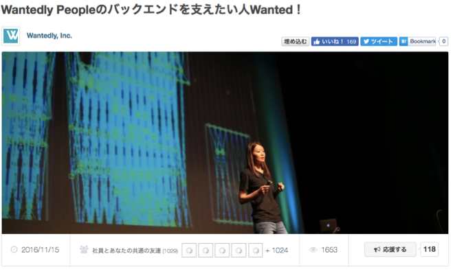 新規事業・資金調達・事業アライアンスなど、【いいねが集まりやすい内容】をWantedlyで掲載し、応援ボタンからシェアをします。すると、その記事にされた「シェア」や「いいね」がそのままWantedlyの「応援」になるので、結果的に応援が増えることになります。 「どんな募集なら社員が喜んでシェアしてくれるのか」という視点から募集を掲載するのも一つの方法です!